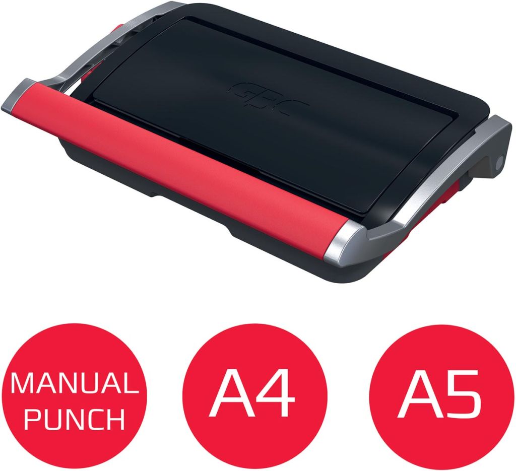 - Manuele inbindmachine Ponscapaciteit: 15 vel (80 g/m²) Bindcapaciteit: 195 vel (met bindrug 19 mm) Voor 21-rings plastic bindruggen Geschikt voor ft A3 (langs de smalle kant), A4 en A5 Met dubbele handgreep voor moeiteloze en soepele inbindervaring Aanpassing van de zijmarge voor nauwkeurige uitlijning Vaste margediepte voor consistente en hoogwaardige inbinding Rubberen antislip voetjes voor stabiele en veilige plaatsing Handig opvangbakje en een opbergvak voor accessoires Kleur: zwart, rood en zilver
