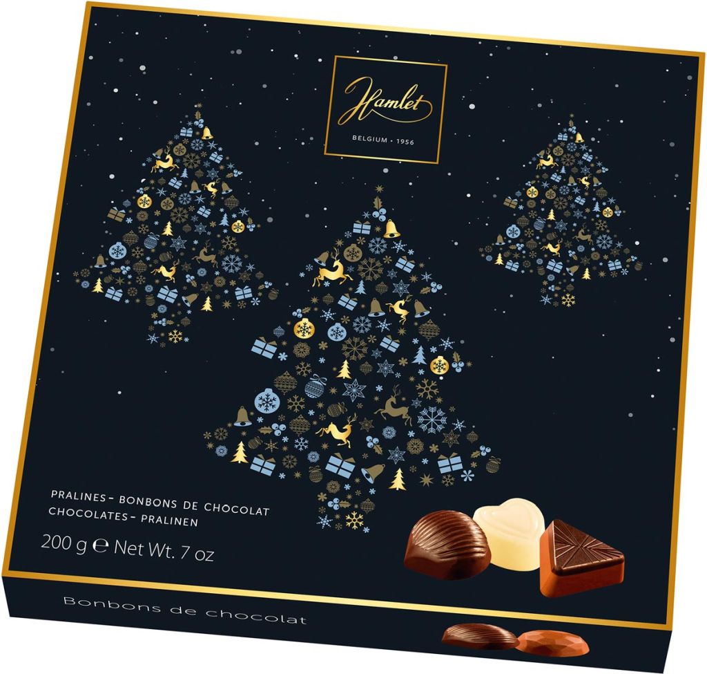 - 20 pralines van melk-, witte en pure chocolade 100 % alcholvrij In een kerstboomverpakking Doos van 200 g