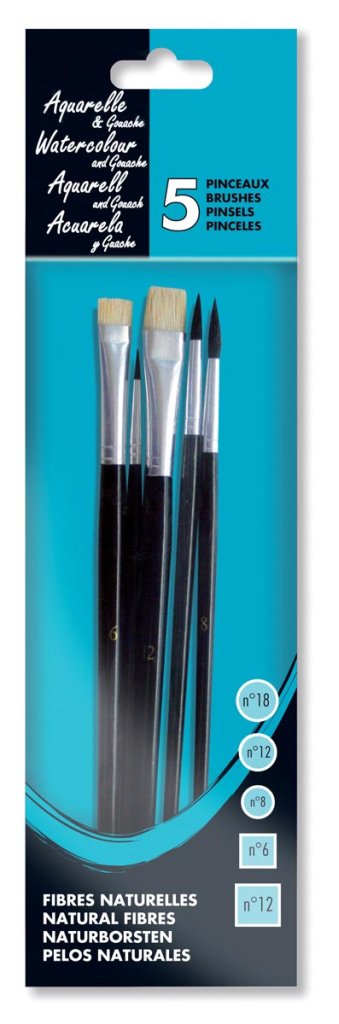 - Kartonnen ophangetui van 3 ronde penselen (nr 8, 12, 18) in eekhoornhaar en 2 platte penselen (nr 6, 12) in varkenshaar