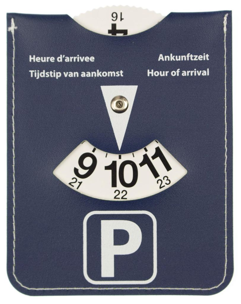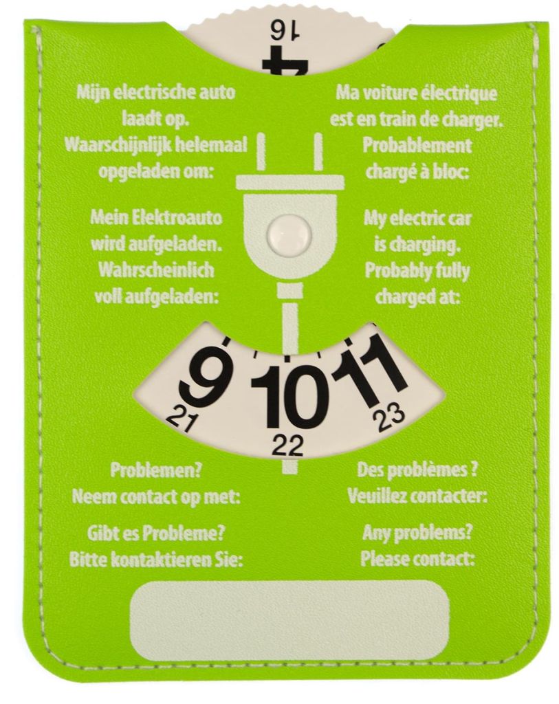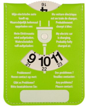 - Geef de eindtijd van uw oplaadtijd aan Mogelijkheid om contactinfo toe te voegen Tweezijdig: achterkant is een standaard parkeerschijf Blauwe parkeerschijf niet voor gebruik in België Voldoet aan de Wegenverkeerswet Kleur: groen/blauw