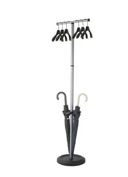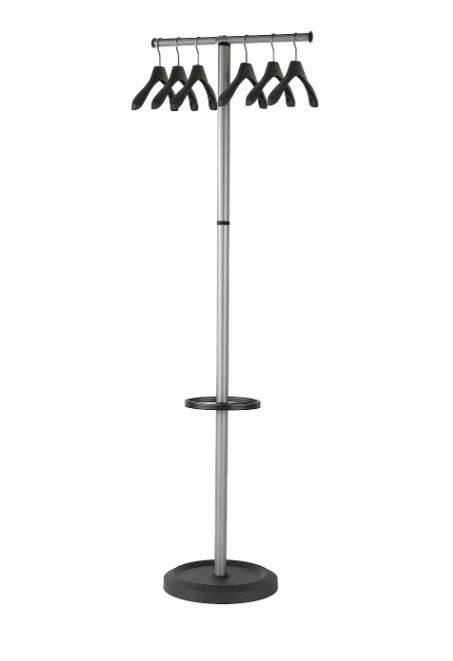 - Rechtstaande kapstok Uit hoogwaardig staal, afgewerkt met zilveren poedercoating Met paraplustandaard 6 zwarte kledinghangers meegeleverd Ft 50 x 35,5 x 173 cm Kleur: zwart