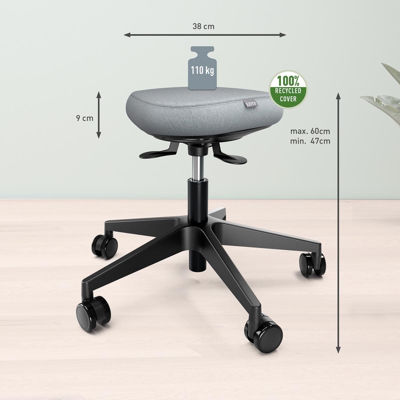 - De Leitz Ergo Actieve Zitkruk helpt je om energiek, comfortabel en actief te blijven tijdens je werkdag met elke beweging die je maakt! Ergonomische zithouding 100% post consumer gerecyclede stoelbekleding met OEKO TEX 100 certificering In hoogte verstelbaar: 47 60 cm Driehoekige vorm met unieke Dual Density Foam (DDF) comfortzitting 9 cm dikke kantelbare zitting met 360° DSM Dynamic Spine Motion-technologie Met 5 wieltes, 360 ° zwenkbaar Max