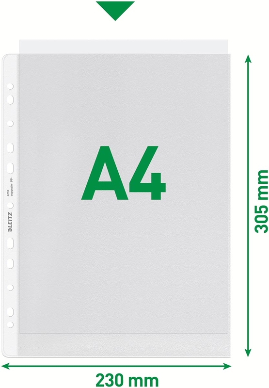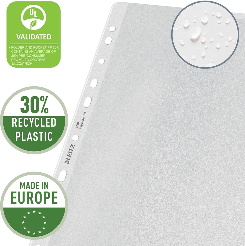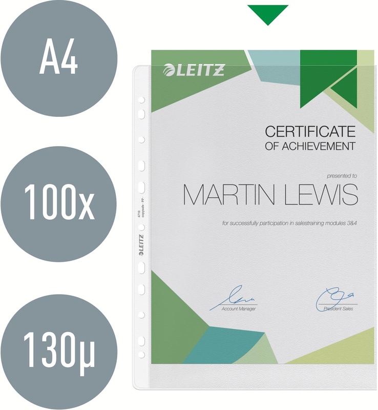 - Uit 30% pre-consumer gerecycleerd PP Gekorreld voor ft A4, 11-gaatsperforatie, opening aan bovenzijde, 130 micron, doos van 100 stuks