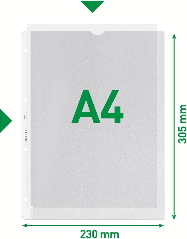 - Uit 30% pre-consumer gerecycleerd PP Gekorreld voor ft A4, 4-gaatsperforatie, met perforatiestrip, opening aan boven- en linkerzijde, 130 microns, doos van 100 stuks