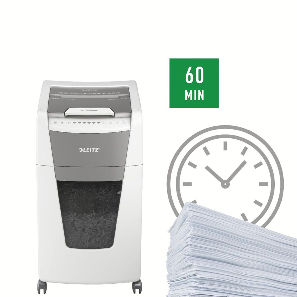 - Capaciteit: 300 blad Werkduur van 60 minuten Vernietigt nietjes paperclips en kredietkaarten Beveiliging tegen vastlopen PIN slot Capaciteit opvangbak: 60 l Op wieltjes Ft 46,5 x 41,5 x 73,5 cm Kleur: grijs Cashback actie via www.leitzcashbackeurope.com