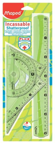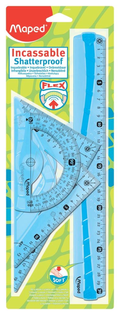 - 4-delige tekenset: 1 lat van 30 cm, 1 winkelhaak 45°/21 cm, 1 winkelhaak 60°/21 cm en 1 gradenboog 180°/12 cm