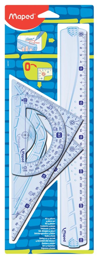 - 4-delige tekenset: 1 lat van 30 cm, 1 winkelhaak 45°/21 cm, 1 winkelhaak 60°/21 cm en 1 gradenboog 180°/12 cm