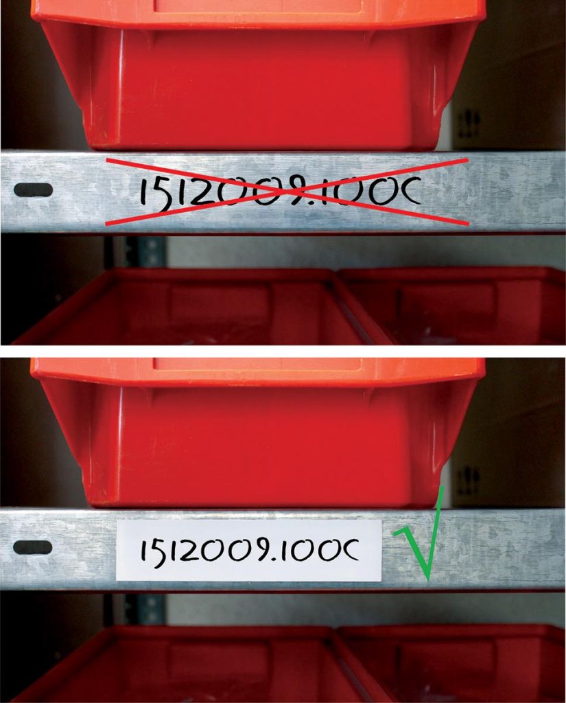 - Werkwijze: etiketband afsnijden of knipper, beschrijven op de gekleurde zijde, op magneethoudend oppervlakte aanbrengen en klaar