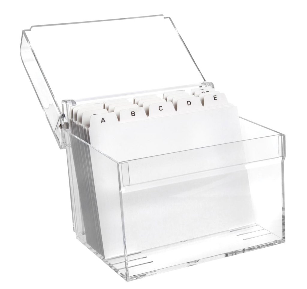 - A-Z register Gevuld met 100 kaarten Met ruimte voor etiket Onderkant en deksel met scharnier verbonden Uit acryl Kleur: transparant