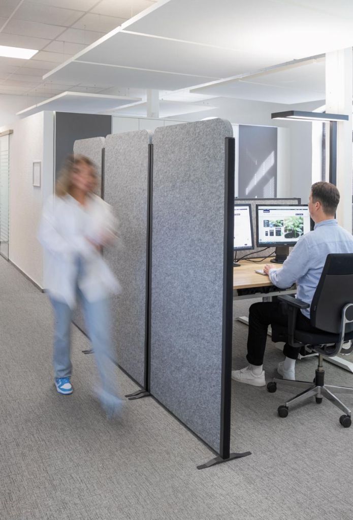 - Modulaire, vrijstaande akoestische scheidingswand met sterke geluidsabsorptie