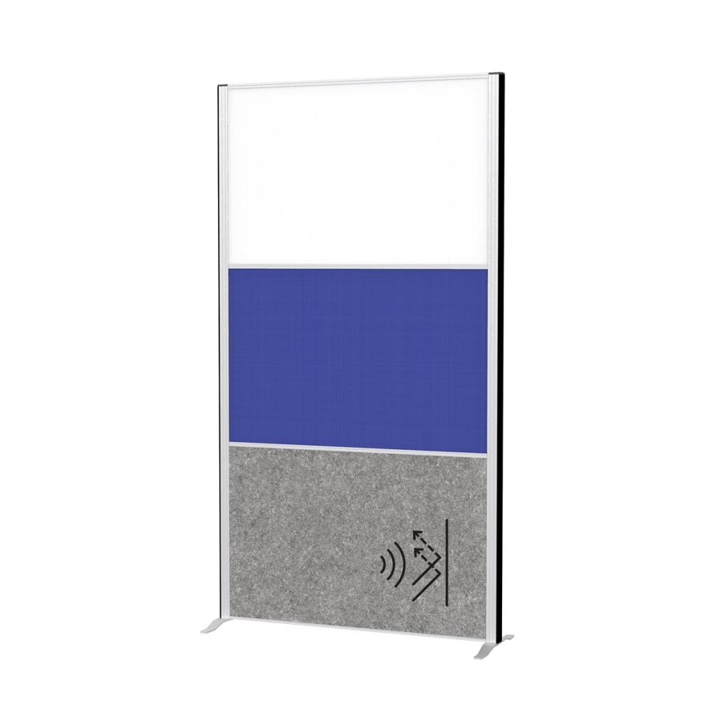- 5 jaar garantie Samenstelling: 1 x whiteboard, 1 x blauw textiel, 1 x akoestisch donkergrijs paneel, frame zilver, met voet