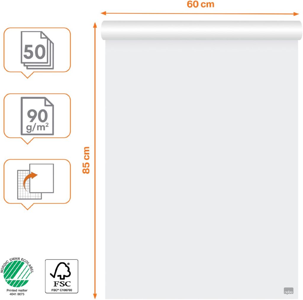 Nobo flipchartpapier premium, ft 60 x 85 cm, blanco/geruit, rol van 50 vel