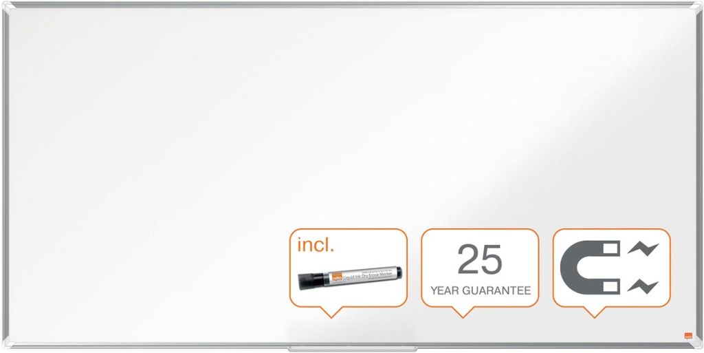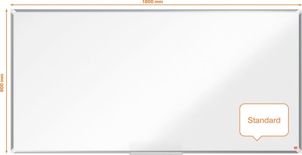 - 25 jaar garantie op het oppervlak Geëmailleerd, magnetisch oppervlak Uitstekend wisbaar Met modern, stijlvol aluminium frame Bevestigd aan de wand door traditionele hoekmontage Ruime pennengoot Met Nobo marker ft 180 x 90 cm