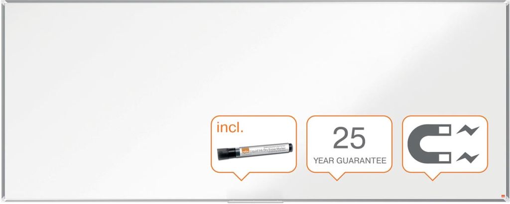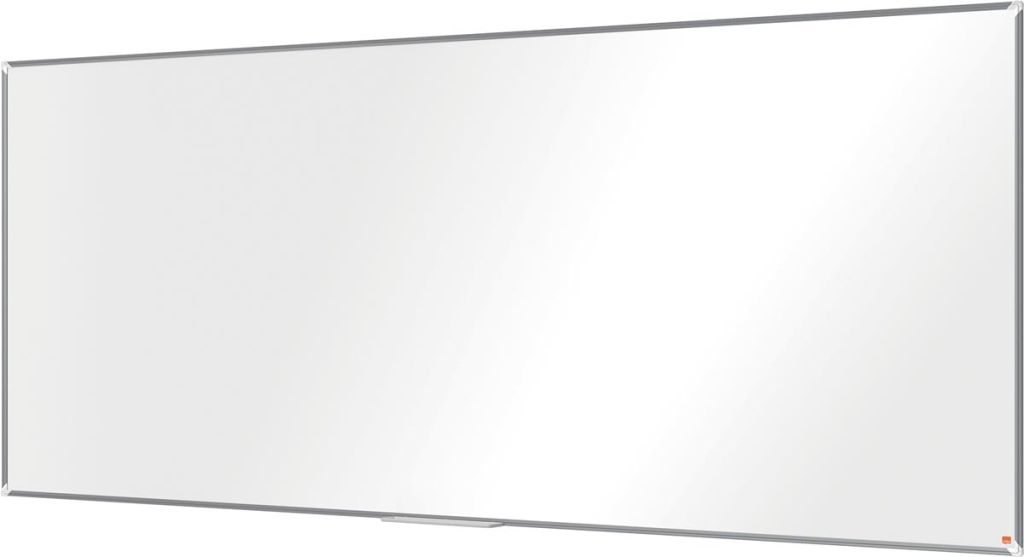 - 25 jaar garantie op het oppervlak Geëmailleerd, magnetisch oppervlak Uitstekend wisbaar Met modern, stijlvol aluminium frame Bevestigd aan de wand door traditionele hoekmontage Ruime pennengoot Met Nobo marker ft 300 x 120 cm