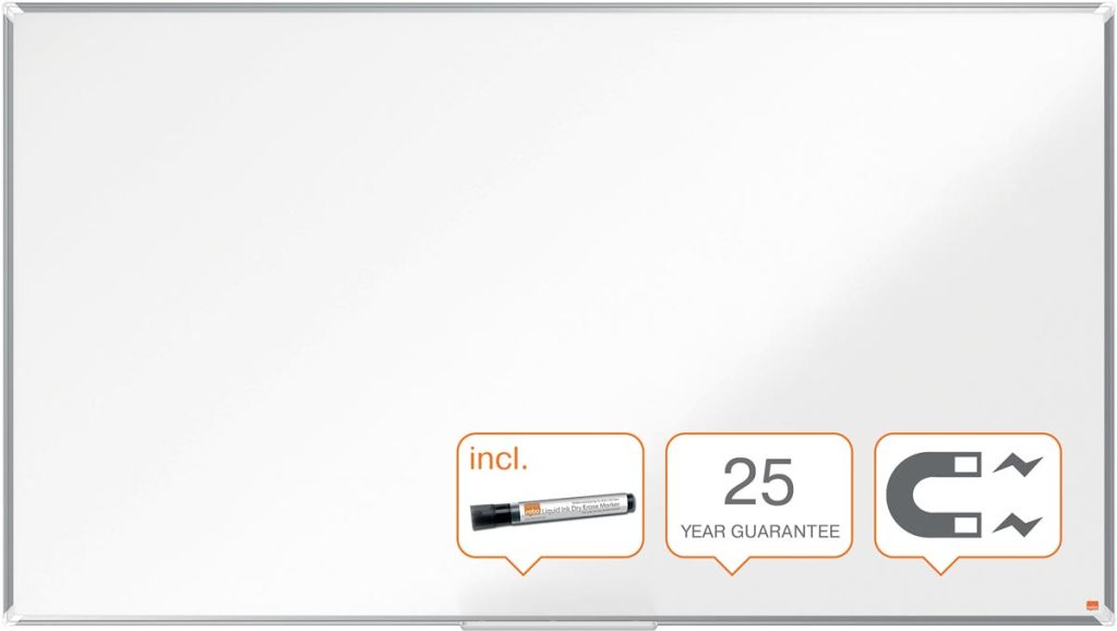 - 25 jaar garantie op het oppervlak Ft Widescreen Geëmailleerd, magnetisch oppervlak Uitstekend wisbaar Met modern, stijlvol aluminium frame Bevestigd aan de wand door traditionele hoekmontage Ruime pennengoot Met Nobo marker ft 188 x 106