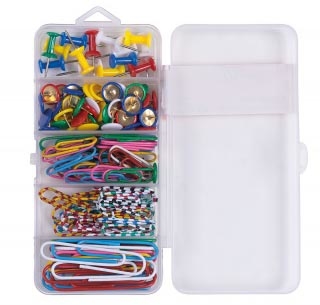 - Transparant doosje met vakjes Inhoud: - 15 x push pin in geassorteerde kleuren - 50 x punaise in geassorteerde kleuren - 30 x papierklem 26 mm gekleurd - 20 x papierklem gestreept 28 mm - 20 x papierklem 50 mm in geassorteerde kleuren