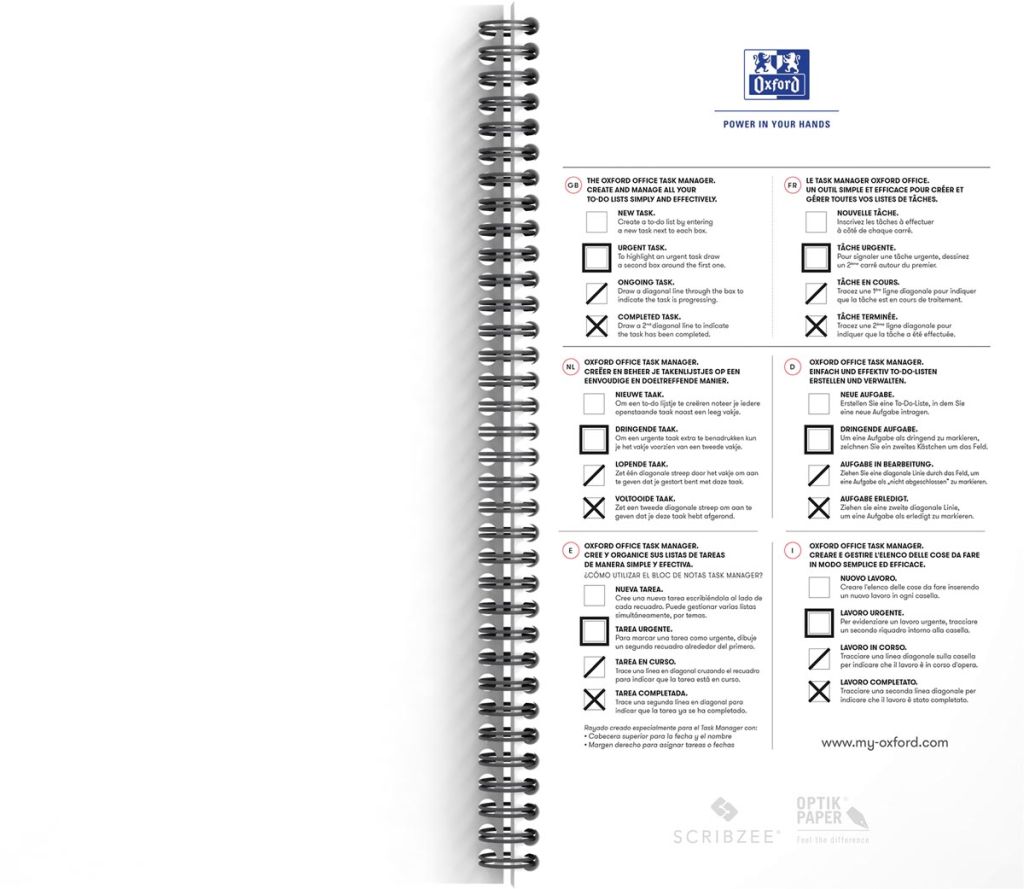 - Task Manager is spiraal gebonden om het gebruik van beide zijden van het vel te vergemakkelijken