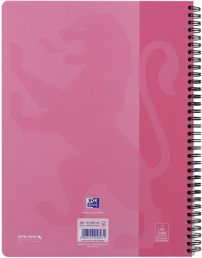 - Optik papier van 90 g/m² Met spiraalbinding Met uitscheurbare vellen Soepele geplastificeerde kartonnen kaft Met scanfunctie Compatibel met Scribzee app Certificaat: EU Ecolabel ft 22 x 29,5 cm (A4+), 160 bladzijden (80 vel), gelijnd, met kantlijn, 23-gaats perforatie, roze