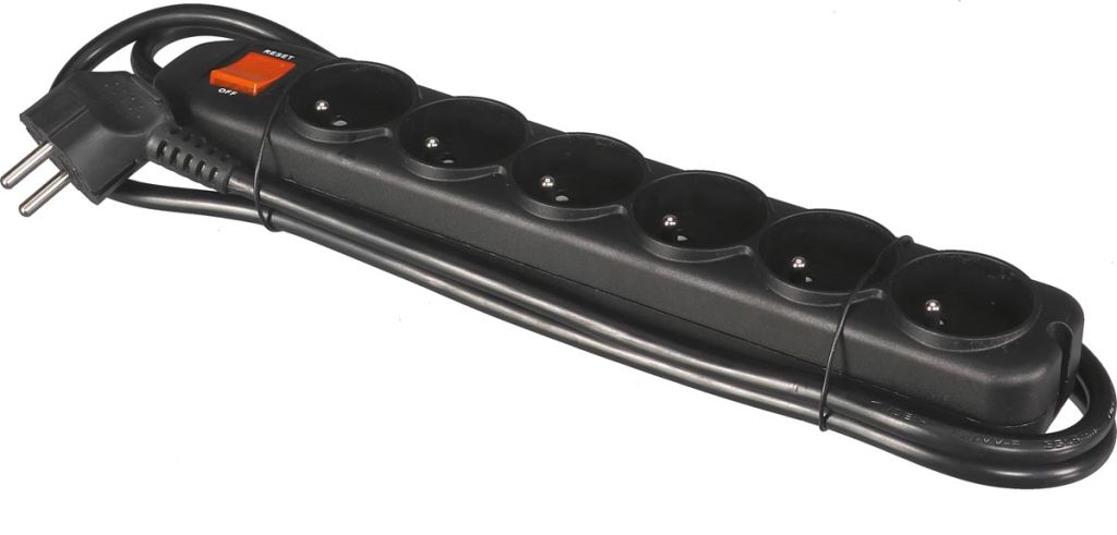 Perel contactdoos met 6 stopcontacten, schakelaar en overspanningsbeveiliging, zwart, voor België