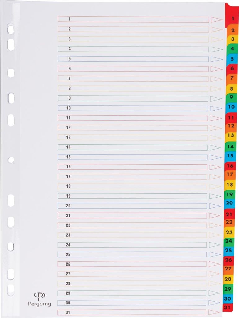 Pergamy tabbladen met indexblad, ft A4, 11-gaatsperforatie, geassorteerde kleuren, set 1-31