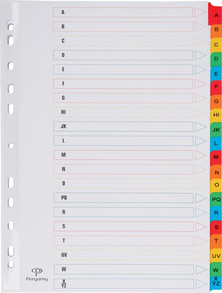Pergamy tabbladen met indexblad, ft A4, 11-gaatsperforatie, geassorteerde kleuren, A-Z 20 met tabs