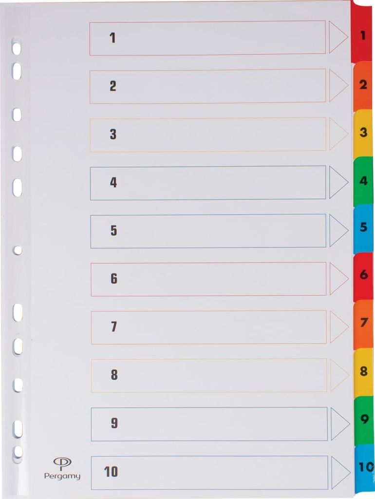 Pergamy tabbladen met indexblad, ft A4, 11-gaatsperforatie, geassorteerde kleuren, set 1-10
