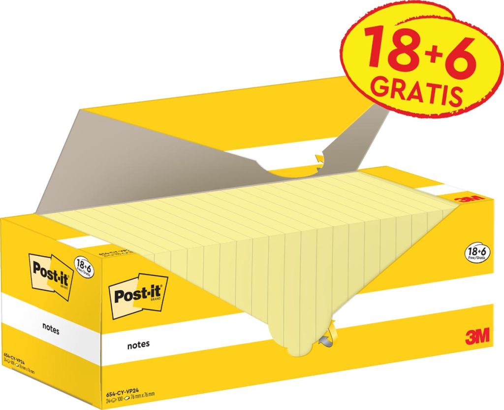 Post-it Notes, 100 vel, ft 76 x 76 mm, kanariegeel (canary yellow), 18 blokken + 6 GRATIS