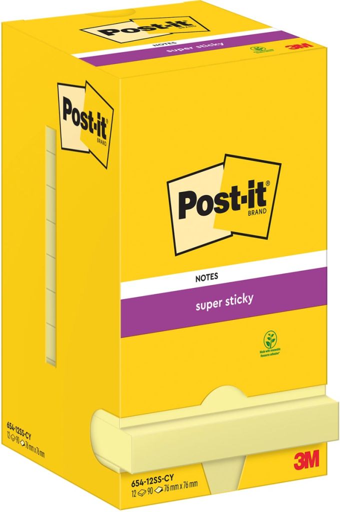 Post-It Super Sticky Notes, 90 vel, ft 76 x 76 mm, geel, pak van 12 blokken