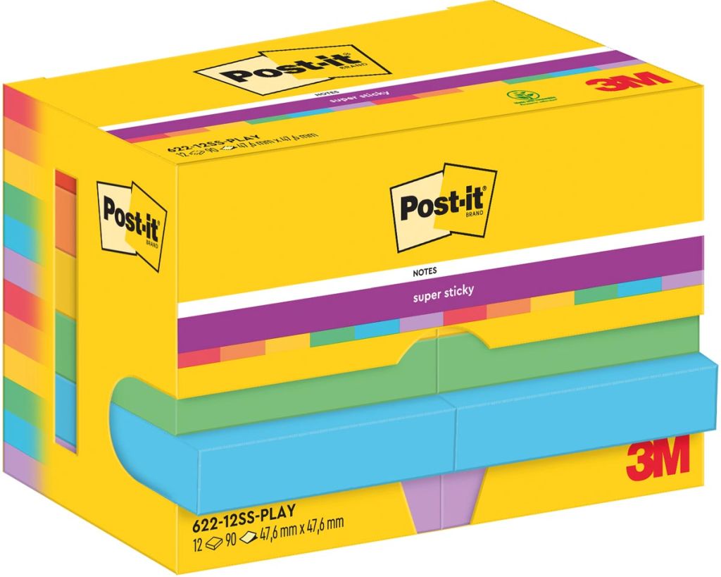 Post-It Super Sticky Notes Playful, 90 vel, ft 47,6 x 47,6 mm, pak van 12 blokken