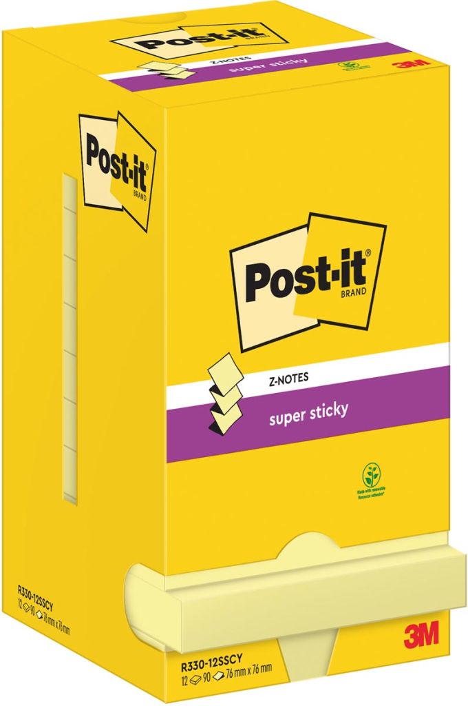 Post-It Super Sticky Z-Notes, 90 vel, ft 76 x 76 mm, geel, pak van 12 blokken