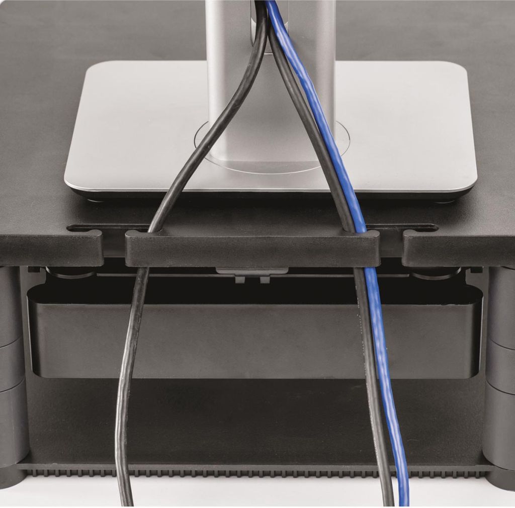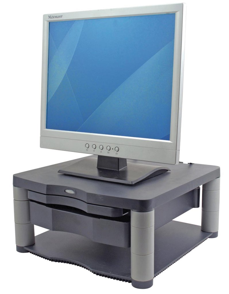 -Geschikt voor CRT- of TFT beeldschermen van 36 kg of 21”. -Plaatst het beeldscherm op een comfortabele kijkhoogte en helpt de werkplek rond het beeldscherm te ordenen. -Inclusief lade van 5,1 cm en ingebouwde documenthouder In vijf verschillende hoogtes te verstellen, van 6,4 tot 16,5 cm. -Grafiet.