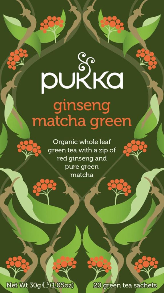 - Pukka; biologische landbouw, eerlijke handel (Fair Trade) en behoud en bescherming via handel Ginseng Matcha Green, pak van 20 stuks