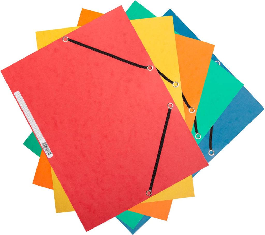 - Voor ft A4 (24,3 x 32 cm) Uit manilla karton van 375 g/m² Met 3 kleppen en elastosluiting Met rugetiket Capaciteit: 200 vel Certificaat FSC pak van 10 stuks, geassorteerde kleuren