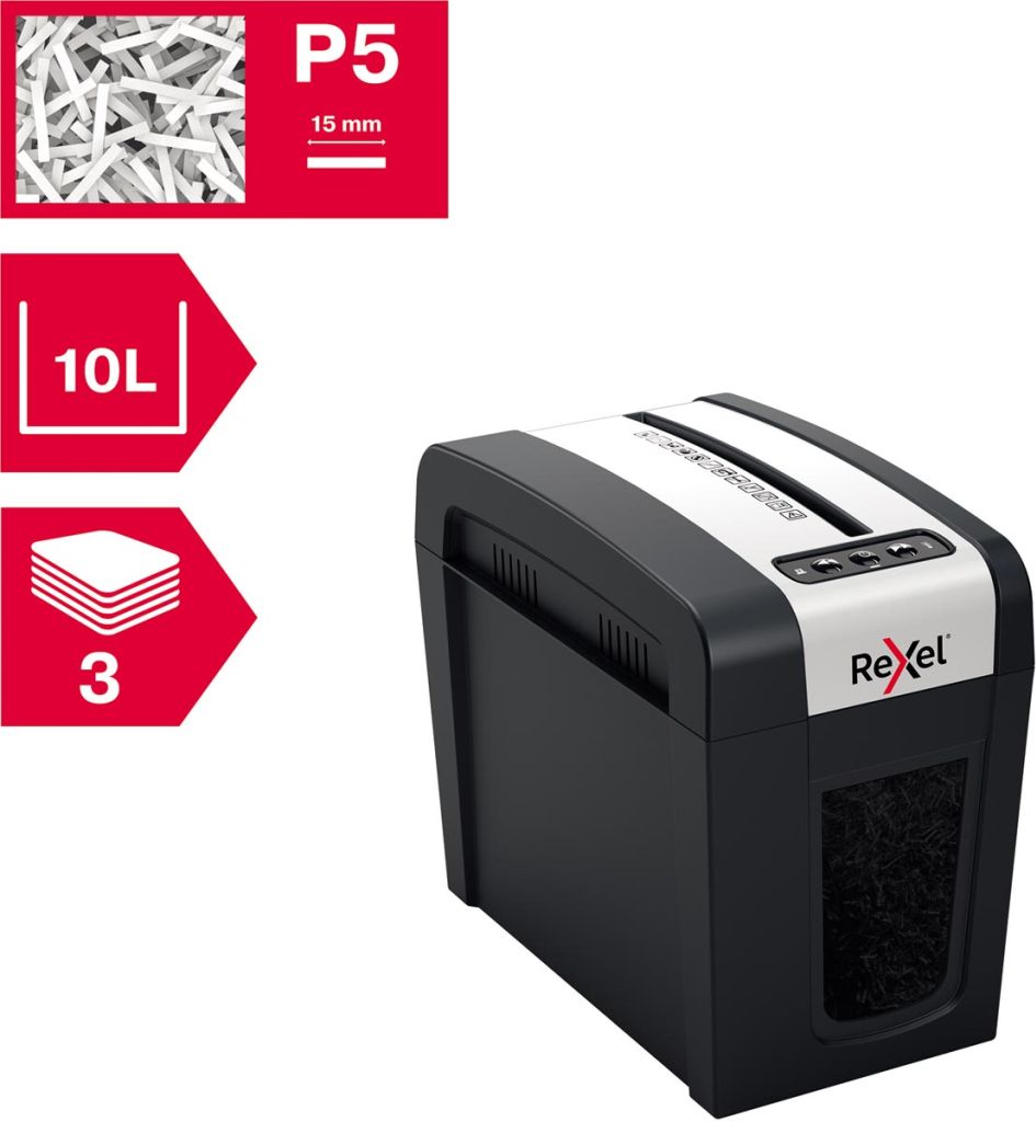 - Capaciteit: tot 3 vel in één keer Cross Cut (2 x 15 mm) Veiligheidsniveau: P-5 Continue werkduur van 6 minuten Whisper-Shred functie met een laag geluidsniveau (minder dan 60 dBA) Handmatige vooruit / terugloopfunctie Capaciteit opvangbak: 10 l Ft19 x 28 x 33 cm (b x h x d) Kleur: zwart
