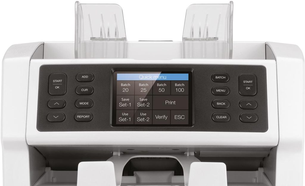 - Telt en sorteert euromunten Telt tot 1.200 biljetten per minuut Hoge invoercapaciteit: 500 biljetten om grote hoeveelheden te tellen 14 standaard valuta's voor het controleren en tellen Telt gesorteerde bankbiljetten voor alle valuta's Telt ongesorteerde bankbiljetten voor EUR, GBP, USD, CHF, PLN, BGN, CZK, HUF, HRK, RON, TRY, SEK, NOK, DKK 100% getest (www.ecb.eu, www.bankofengland.co.uk) 7-voudige valsgelddetectie: ultraviolet, magnetische inkt, metaaldraad, infrarood, afbeelding, afmetingen en dikte Dubbel pocket configuratie: verdachte bankbiljetten worden in de reject pocket geplaatst, terwijl het telproces doorgaat Dubbele CIS-detectietechnologie Instelbare telsnelheid: 800, 1.000 en 1.200 biljetten per minuut Automatische valuta- en denominatieherkenning Ondersteunt scannen op serienummer (EUR, GBP, USD, CHF, TRY) Telt en verifieert oude en nieuwe serie Eurobiljetten (ES-1/ES-2) Telfuncties: Mix, Value-Mix, Multi-Mix, Sort, Sort Version, Face, Orient en Sheet Counting Multi-Mix: telt verschillende valuta's door elkaar, van tevoren sorteren is niet nodig Value-Mix: telt in stapels van een vooringestelde waarde Sort Version: sorteert oude en nieuwe versies van bankbiljetten Oriënteert en kopt bankbiljetten in twee pockets Sheet Counting: tellen van aantallen zonder valsgelddetectie Optel- en batchfunctie Dubbele bedieningsfunctie met individuele voorinstellingen Automatische en manuele startfunctie Compact ontwerp Gebruiksvriendelijk bedieningspaneel Scherm: 3,2"" TFT-kleurenscherm Stackercapaciteit: 220 bankbiljetten Capaciteit reject pocket: 50 bankbiljetten Valuta-updates installeren via de