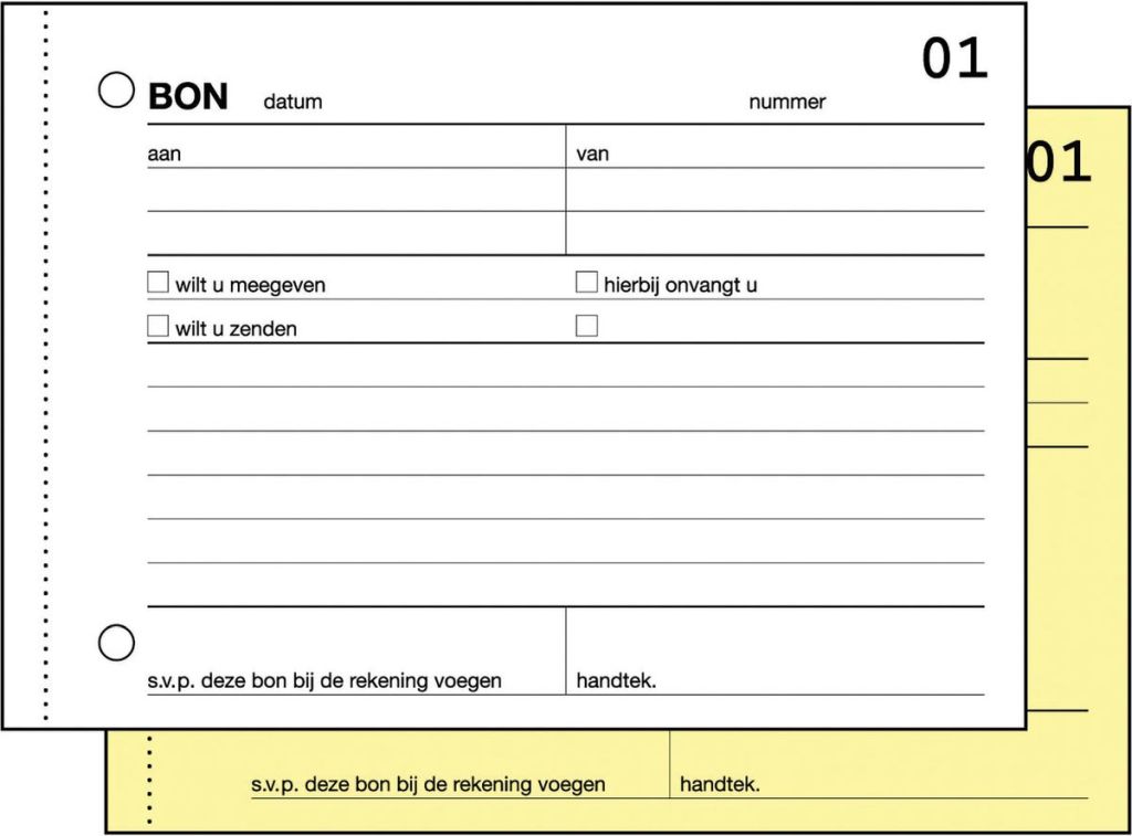 - Ft 10,5 x 14,8 cm (A6) Papier van 60 g/m² Dupli (50 x 2 vel), zelfkopiërend Met 2-gaatsperforatie Genummerd Nederlandstalig