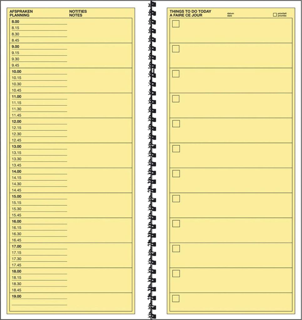 - Uw checklist voor elke dag Op de linkerpagina een tijdsplanner met daarnaast ruimte voor notities Op de rechterpagina ruimte voor je To Do's Ft 14 x 29,7 cm Uit 100 % gerecycleerd papier van 70 g/m² Blok van 100 vel Certificaat: FSC Mix