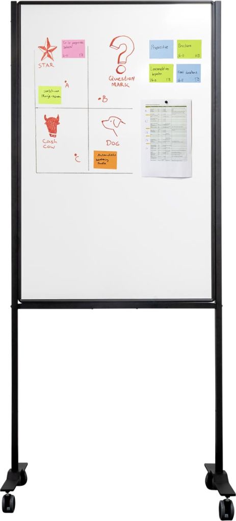 - Dubbelzijdig en magnetisch Droog uitwisbaar Zwart aluminium frame 4 wielen waarvan 2 met rem, gemakkelijk te verplaatsen en te draaien Meerdere whiteboards passen haaks in elkaar om een hoek te vormen Meerdere whiteboards passen compact tegen elkaar om op te bergen stalen oppervlak, ft 120 x 75 cm