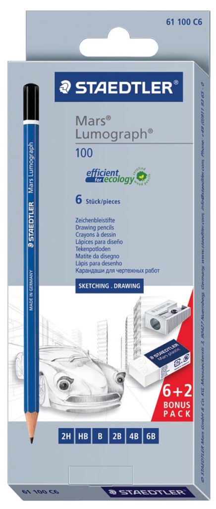 - Etui met 6 hardheden (2H-HB-B-2B-4B-6B) + gratis slijper en mini gom Mars plastic