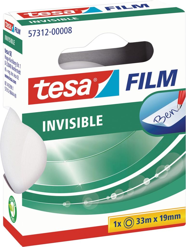 - tesafilm® Invisible is precies wat de naam zegt: een vrijwel onzichtbare tape bedoeld om een gescheurd document of twee losse vellen papier onopvallend aan elkaar te plakken