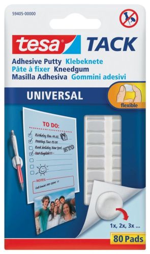 - tesa® TACK kneedgum is een witte, zeer sterke en herbruikbare kleefgum voor bevestiging van voorwerpen thuis en op kantoor, zelfs op een oneffen ondergrond