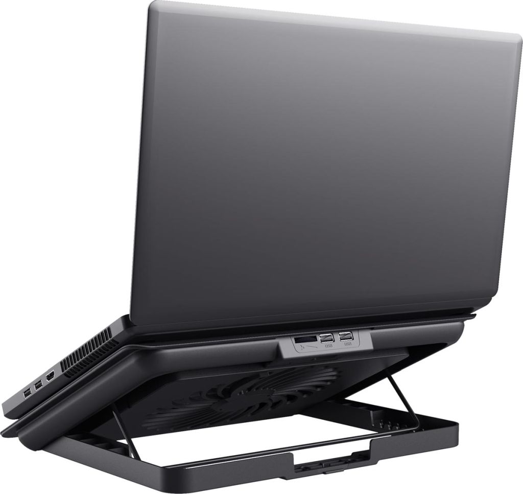 - Uit gerecycleerde materialen Geïntegreerde koelventilator van 180 mm In 8 niveaus aanpasbaar Verbeterde koelefficiëntie van uw notebook Beschermt meubels en benen tegen hitte Voor laptops tot 16 inch Ventilatoren met USB-voeding, geen stopcontact nodig Kleur: zwart