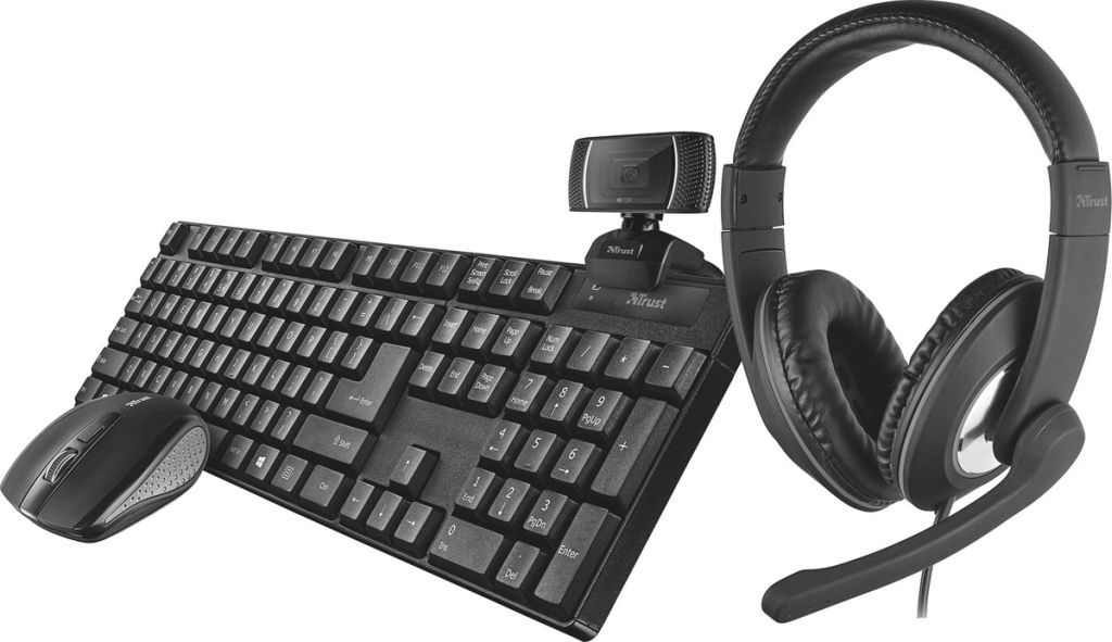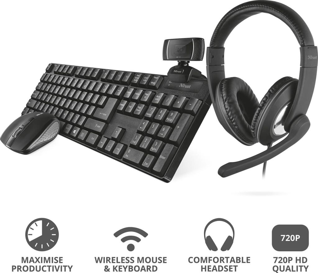Trust Qoby 4-in-1 Home Office Set met Webcam, headset, toetsenbord (azerty) en muis
