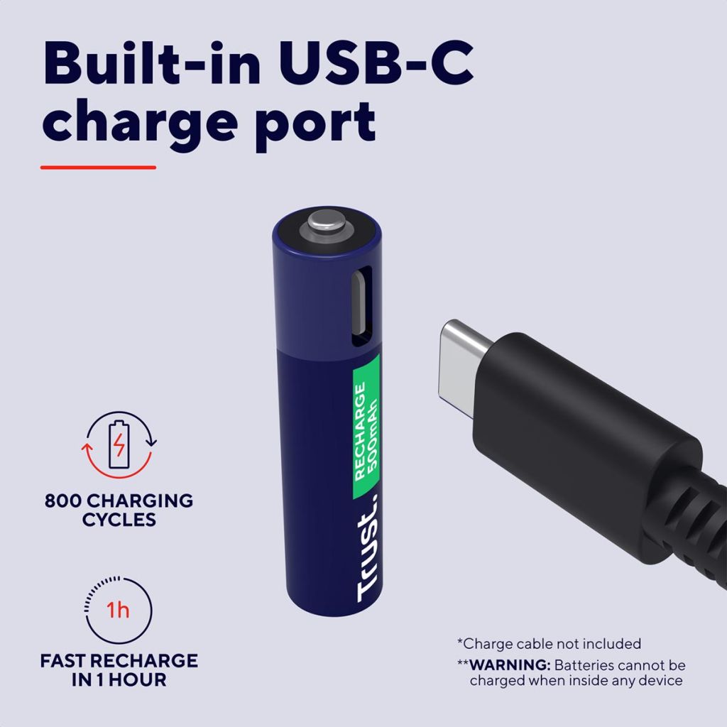 Trust USB-C herlaadbare batterijen AAA, blister van 2 stuks