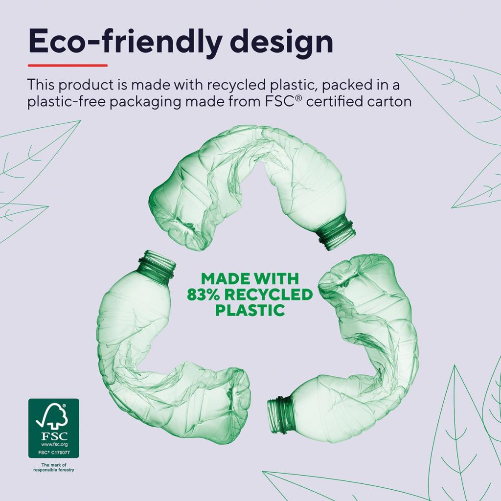 - Uit 83 % gerecycleerd kunststof Met opbergbare micro-USB-ontvanger Voor rechtshandigen Met 4 stille knoppen Aanpasbare gevoeligheid (800 - 1600 dpi) Draadloos bereik van 8 m Werkt op 1 AA-batterij (meegeleverd) zwart