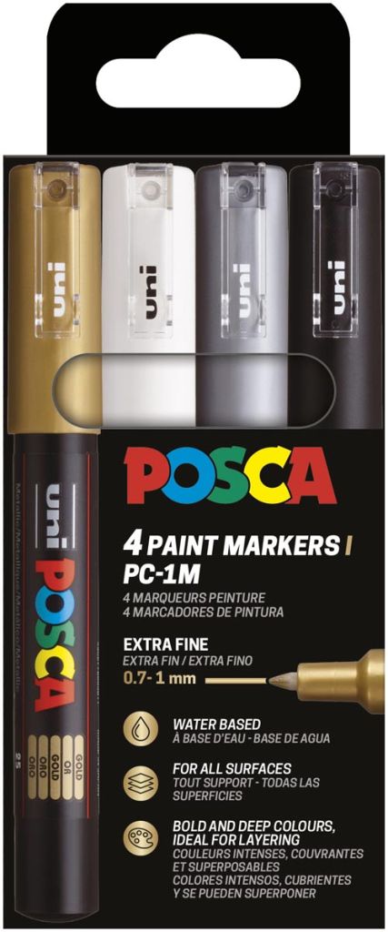 Uni POSCA paintmarker PC-1MC, 0,7 - 1 mm, etui van 4 stuks, goud, zilver, wit en zwart