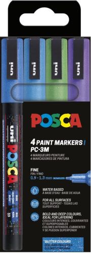 Uni POSCA paintmarker PC-3ML, 1,5 mm, glitter, etui van 4 stuks donkerblauw, lichtblauw, groen en violet