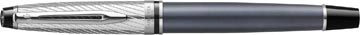 - Huls met conisch silhouet en dop met laser-gegraveerde, voorgevormde strepenpatroon Met exclusieve gelakte huls, kenmerkende Waterman-clip met dubbele vertakking en schuine dop Roestvrijstalen penpunt Kleur inkt: blauw In giftbox Medium punt Metallic steengrijs CT