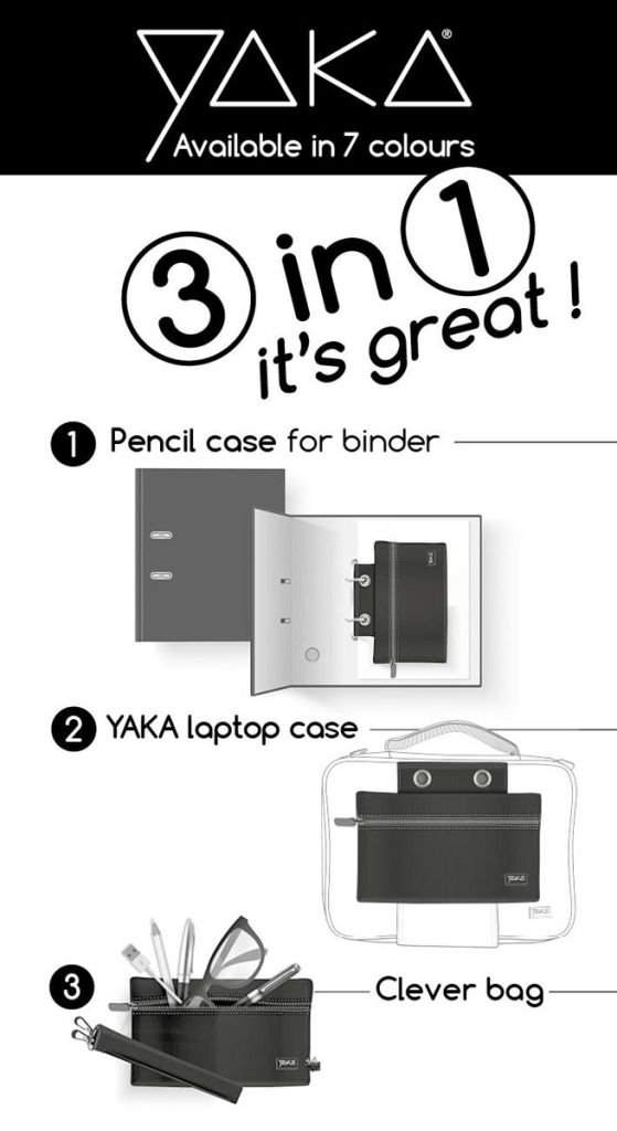 - Gebruik 1: bevestiging aan de ringen van een ordner Gebruik 2: deze etui kan worden toegevoegd aan de YAKA laptoptas Gebruik 3: handig tasje -geschikt voor pennen, potloden, rekenmachine, latten,..